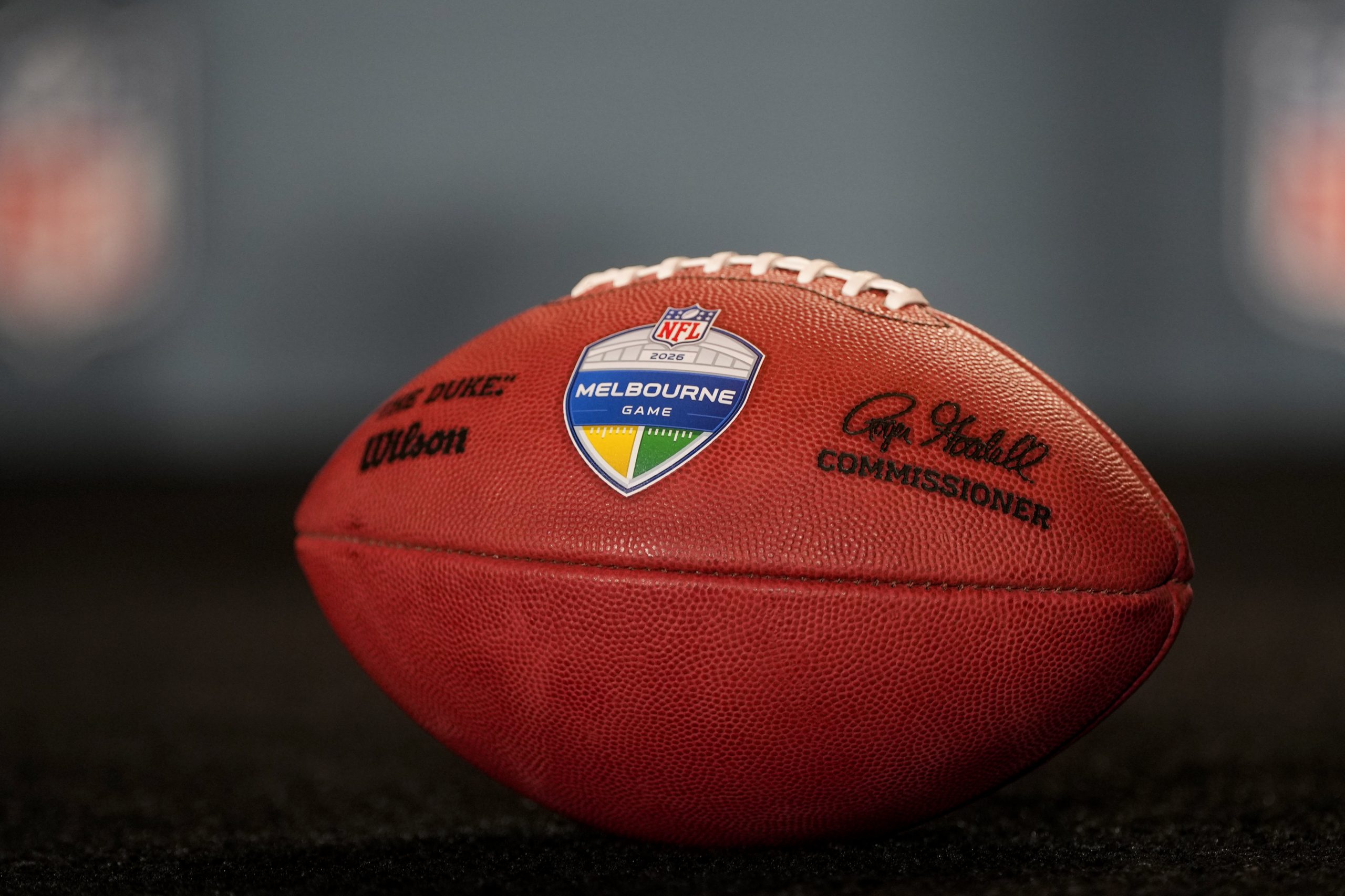 An NFL football with a Melbourne 2026 logo seen at an international press conference announcing the 2026 NFL Melbourne Game on Wednesday, Feb. 5, 2025 at Ernest N. Morial Convention Center in New Orleans. (Doug Benc/AP Content Services for the NFL)